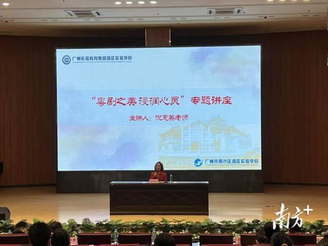 廣州市南沙區(qū)灣區(qū)實(shí)驗(yàn)學(xué)校活動(dòng)現(xiàn)場(chǎng),倪惠英為學(xué)校師生作專題講座。