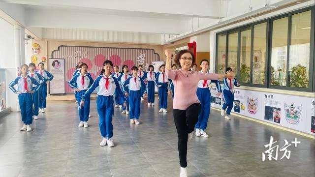 倪惠英指導(dǎo)學(xué)生跳粵韻操。圖源:廣州市南沙區(qū)灣區(qū)實(shí)驗(yàn)學(xué)校教師劉宇帆