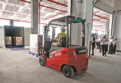 南沙國際物流中心開倉儀式上,工作人員駕駛叉車卸貨