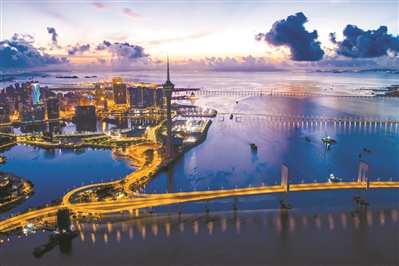 10余公里外,300米高的珠海中心聳立在濠江之側(cè)。站在頂樓極目遠(yuǎn)眺,左手澳門(mén),右手橫琴,都市天際線渾然一體,蔚為壯觀。