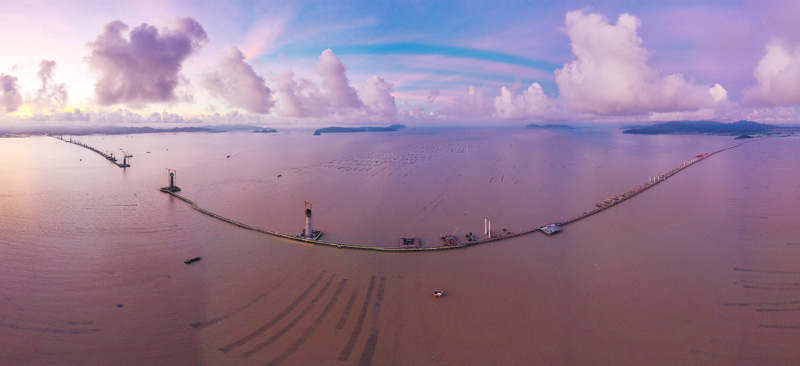 建設中的黃茅海跨海通道(6月27日攝,無人機全景照片)。黃茅海跨海通道東起珠海市平沙鎮,西接江門市斗山鎮,橫跨珠江口崖門入海口黃茅海水域,線路全長約31公里,預計2024年建成通車。