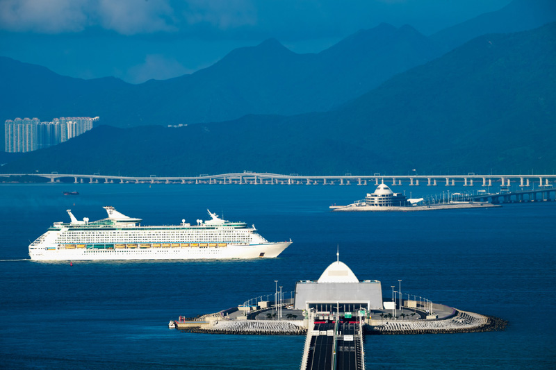 一艘巨輪通過港珠澳大橋東、西人工島之間的伶仃洋主航道(2018年7月27日攝)。港珠澳大橋橫跨珠江口伶仃洋海域,全長約55公里,集橋、島、隧于一體,是世界最長的跨海大橋。