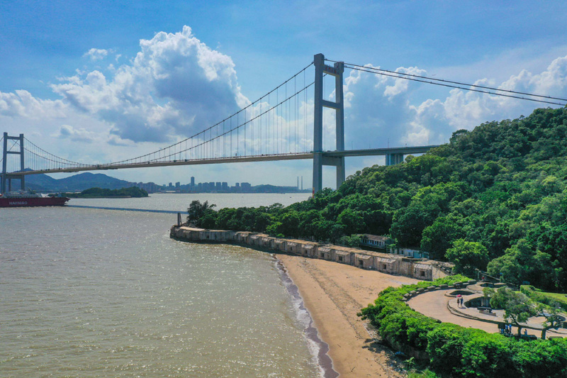 虎門大橋緊鄰鴉片戰爭古戰場遺址之一的威遠炮臺(2020年6月23日攝,無人機照片)。虎門大橋橫跨珠江口獅子洋水道,連接廣州市南沙區與東莞市虎門鎮。