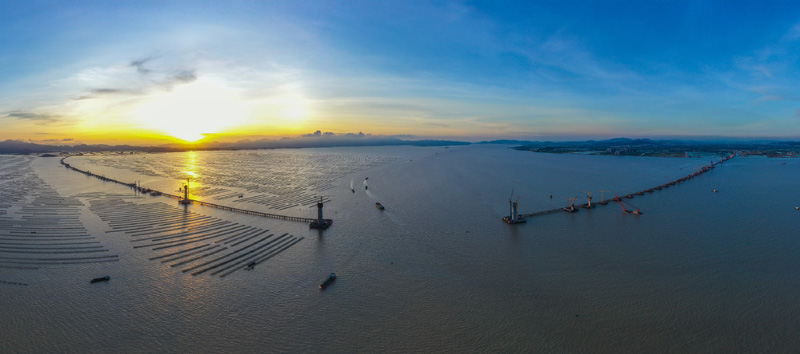 建設中的黃茅海跨海通道(6月28日攝,無人機全景照片)。黃茅海跨海通道東起珠海市平沙鎮,西接江門市斗山鎮,橫跨珠江口崖門入海口黃茅海水域,線路全長約31公里,預計2024年建成通車。