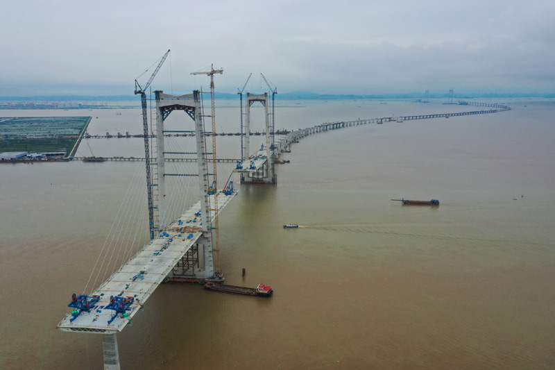 建設中的深中通道伶仃洋大橋(6月7日攝,無人機全景照片)。深中通道全長24公里,集橋、島、隧、地下互通為一體,連接珠江口東西兩岸的深圳市和中山市,預計2024年建成通車。