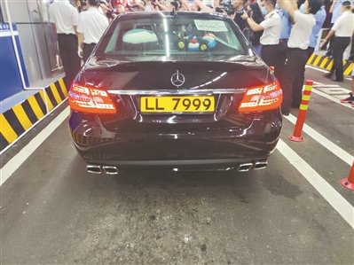 7月1日零時起,“港車北上”政策正式實施,成功預約后的香港機動車可經港珠澳大橋珠海公路口岸駛入廣東。“LL7999”這輛香港單牌車,是第一輛入境的“北上”港車,車主李先生隨車“一站式”通關后順利入境。數分鐘后,又一輛KA714牌香港私家車駛入港珠澳大橋珠海口岸。