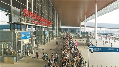 今年10月18日早上8點,來自武漢的導游蘇桂萍帶著38名來自湖北的游客在標有“港珠澳大橋珠海公路口岸”的大廳門口完成“打卡”拍照,隨后他們將過關前往香港開啟4日港澳深度游。每天早上出境高峰時段,像這樣頭戴統一顏色標志鴨舌帽的港澳游旅行團擠滿了大橋口岸出境大廳的平臺。