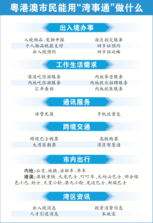 據了解,“灣事通”綜合服務平臺首期在微信、支付寶、AlipayHK(港版支付寶)、MPay(澳門錢包)平臺同步上線。“灣事通”可以讓粵港澳三地居民享受哪些服務?支付寶相關負責人表示,首期主要圍繞三地居民、企業的出行、通訊、支付、吃住游等場景和習慣,提供了超百項服務。以交通服務場景為例,發揮支付寶在掃碼出行、跨境交通上的優勢,“灣事通”小程序匯聚了市內交通、跨境出行兩大場景。在市內交通上,聚焦灣區內“9+2”城市的公交、地鐵,內地居民赴港澳乘坐港鐵重鐵網絡、九龍巴士、新城巴士、天星小輪、電車等公共交通工具,都可以掃碼出行;跨境交通上,廣深港高鐵、跨境巴士、輪渡等多種跨境方式,游客手機點一點即刻出發,免去貨幣兌換。