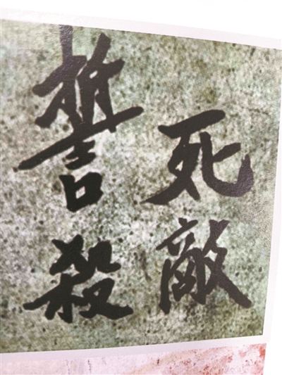 朱德在指揮三河壩戰(zhàn)役時書寫的“誓死殺敵”四個墻體大字。