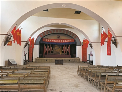 “我們面前這座古樸典雅的建筑就是中央大禮堂,它是為召開黨的七大專門修建的。禮堂建筑由延安自然科學院的楊作才設計,陜北綏德、米脂等地的能工巧匠負責施工,籌建于1940年,1942年建成。朱德同志曾風趣地說,這是我們黨第一次在自己修建的房子里召開代表大會。以前,因為條件所限,黨的前六次代表大會都只能借別人的房子開自己的會。因此這座禮堂具有重大的歷史意義。” 站在中共七大會址前,楊家嶺革命舊址館長侯振龍向記者介紹道。