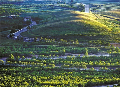 從內蒙古呼和浩特市坐車沿呼北高速一路南馳,過殺虎口,進入山西右玉縣境內時,一排排整齊的松樹、小葉楊和扎在土里的灌木檸條映入眼簾,它們就像哨兵一樣矗立在山脊上,守衛著長城以南的沃土。