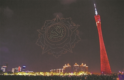 珠水瀲滟,倒映出海心橋流轉(zhuǎn)變幻的水袖之舞;廣州塔旁,1000架無人機凌空翩躚,展開絢麗壯觀的光影畫卷。