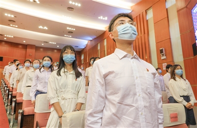 廣州醫科大學附屬市八醫院新冠肺炎救治臨時黨委組織領導班子成員,國家、省、市專家,院中層干部代表集中收看慶祝中國共產黨成立100周年大會直播,并于會后重溫入黨誓詞。