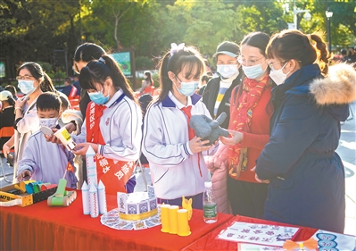 在一場垃圾分類活動上,廣雅小學的同學們向街坊介紹變廢為寶的手工作品。