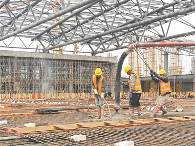 “工程質量是至關重要的大事?!惫こ藤|量總監王向陽腰系安全繩、手持檢測裝置,駕輕就熟地在鋼結構桁架間爬上爬下進行質量檢查。項目2000多名建設者春節期間堅守崗位,分三班投入建設,全力確保工程在2022年秋交會前順利竣工。