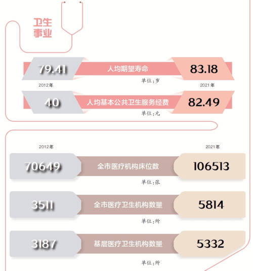 黨的十八大以來,廣州市衛生健康事業獲得長足發展,居民人均預期壽命從2012年的79.41歲提高至2021年的83.18歲,主要健康指標基本達到發達國家水平。