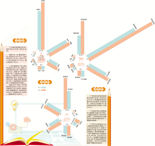 職業教育綜合水平全國領先,9所高職院校入圍國家“雙高計劃”單位,入圍數在全國85個城市中排名第3;11所中職學校入圍省高水平中職學校建設單位,入圍數居全省第一。高等教育規模不斷擴大、人才培養質量持續提高、學科專業特色更加凸顯、科學研究水平不斷提高;廣州醫科大學納入國家第二輪“雙一流”建設高校行列。實現困難學生資助全覆蓋,特殊教育保障水平大幅提升,全市建成資源教室268間,逐一做好適齡殘疾兒童少年的義務教育入學安置工作……