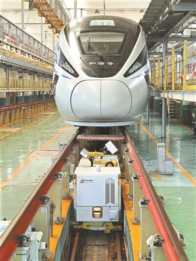 松興電氣動車車底檢測機器人正在為和諧號進行檢修。