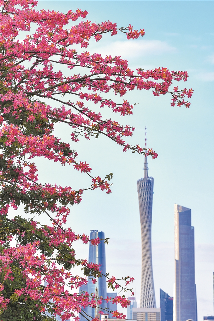 盛開的美麗異木棉與廣州塔及東塔、西塔遙相映襯