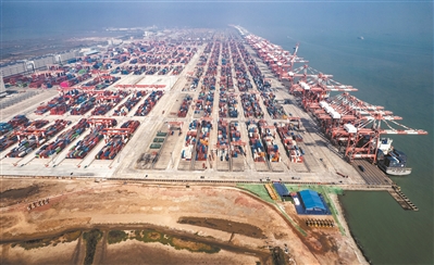歲末,南沙港集裝箱碼頭,貨輪在泊位上有序裝卸,運輸車輛往來穿梭,一派繁忙景象。
