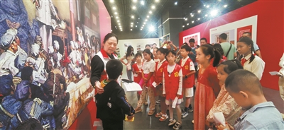 10月2日,在廣州圖書館負一層大展廳,廣州機關黨員志愿者小紅棉服務隊、廣州市新時代文明實踐童心向黨志愿服務隊隊長申東輝帶領二十多名中小學生,穿上紅馬甲,走進了古田會議紀念館、龍巖圖書館、廣州圖書館聯合舉辦的《古田會議——黨和軍隊建設史上的里程碑》主題展覽。