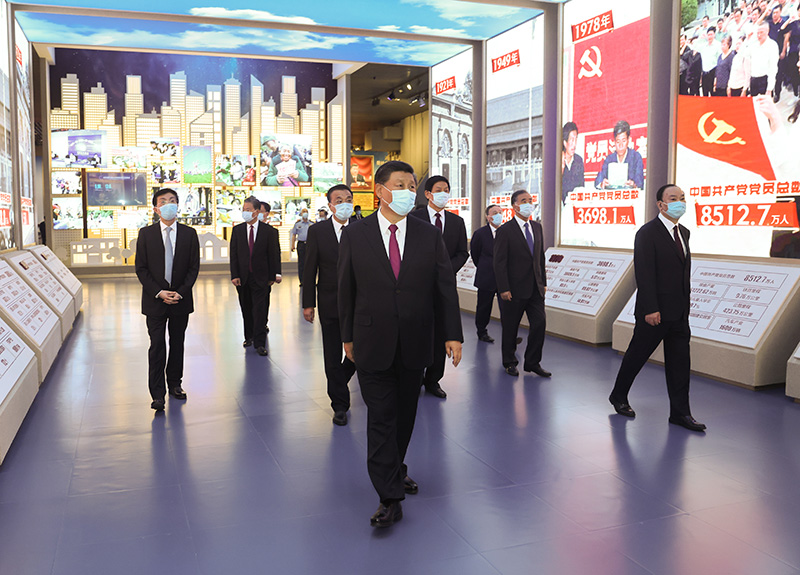 新近落成的中國共產黨歷史展覽館巍然矗立,氣勢恢宏。下午3時20分許,習近平等黨和國家領導同志來到這里,步入展廳參觀展覽。展覽以“不忘初心、牢記使命”為主題,精心設計了“建立中國共產黨 奪取新民主主義革命偉大勝利”、“成立中華人民共和國 進行社會主義革命和建設”、“實行改革開放 開創和發展中國特色社會主義”、“推進中國特色社會主義進入新時代 全面建成小康社會 開啟全面建設社會主義現代化國家新征程”4個部分,通過2600余幅圖片、3500多件套文物實物,第一次全方位、全過程、全景式、史詩般展現中國共產黨波瀾壯闊的百年歷程,濃墨重彩地反映黨的不懈奮斗史、不怕犧牲史、理論探索史、為民造福史、自身建設史,使人們深刻認識到紅色政權來之不易、新中國來之不易、中國特色社會主義來之不易,深刻認識到中國共產黨為什么能、馬克思主義為什么行、中國特色社會主義為什么好。