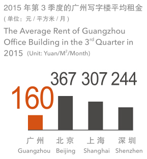 根據仲量聯行截至 2015 年第 3 季度的最新統計,廣州寫字樓平均租金為 160元 / 平方米 / 月,是北京(367 元 / 平方米 / 月)的 43.5%、上海(307 元 / 平方米 / 月)的 52.1%、深圳(244 元 /平方米 / 月)的 65.5%.在用工成本上,廣州的平均工資水平在北上廣深中排名第四,是北京的 80%、上海的 85%.在平均房價上,廣州僅為深圳的 54%、北京的 55% 和上海的 61%,成本優勢明顯。