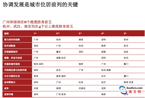 今年就綜合排名而言,廣州和深圳憑借均衡發展的優勢穩居第一和第二;杭州受益于技術優勢位列第三;較好的平衡了發展和成本的武漢位居第四,擁有優質文化和居民生活的南京排名第五。普華永道中國公共政策與監管事務主管合伙人吳衛軍指出:“這五座城市均在四個以上的維度躋身前五,充分顯示出均衡發展的重要性?!?/p>