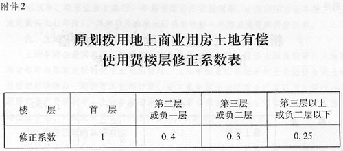 (二)原劃撥土地上房屋補交土地有償使用費作樓層修正(附件2)。當某層商業用房的土地有償使用費樓層修正后低于所在地段綜合(辦公)用途的土地有償使用費標準時,取其所在地段綜合(辦公)用途的土地有償使用費標準。原劃撥土地上綜合(辦公)、住宅、工業用房補交土地有償使用費不作樓層修正。