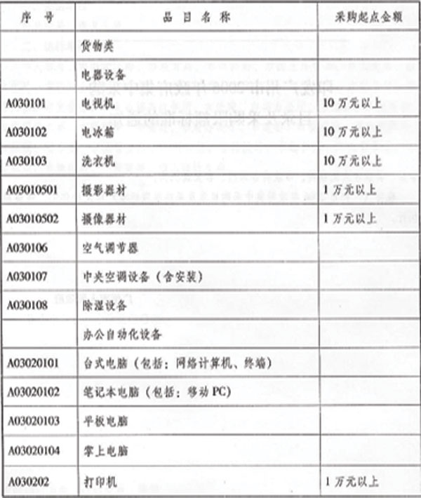 (一)貨物類:單項(個、件)采購預算金額10萬元以上,或批量采購預算金額30萬元以上的貨物。