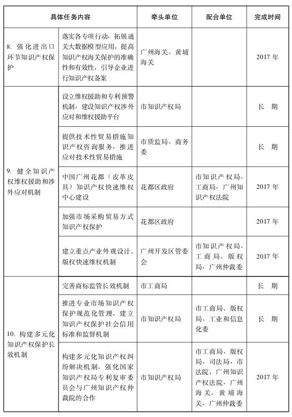 (一)開展知識產權綜合管理改革試點。加快推進中新廣州知識城國家知識產權運用和保護綜合改革試驗,完善知識產權行政管理機制,設立知識產權綜合政務服務中心(牽頭單位:廣州開發區管委會)。推動南沙自貿試驗區知識產權維權援助中心建設,支持南沙設立區域技術產權交易市場,在南沙自貿試驗區建立與國際仲裁模式接軌的知識產權仲裁體系(牽頭單位:南沙區政府,配合單位:廣州仲裁委)。