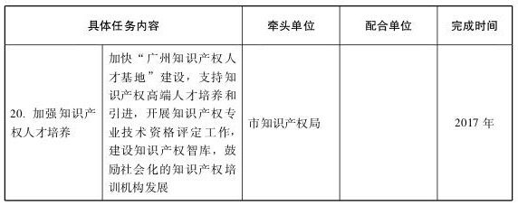 (二十)加強知識產權人才培養。加快“廣州知識產權人才基地”建設;充分利用各大高校、研究機構、中介服務機構、企業等平臺載體,支持知識產權高端人才培養和引進;繼續開展知識產權專業技術資格評定工作;建設知識產權智庫;鼓勵社會化的知識產權培訓機構發展,對開展知識產權教育培訓、宣傳推廣、人才培養、文化培育及軟課題研究等人文基礎建設進行資助(牽頭單位:市知識產權局)。