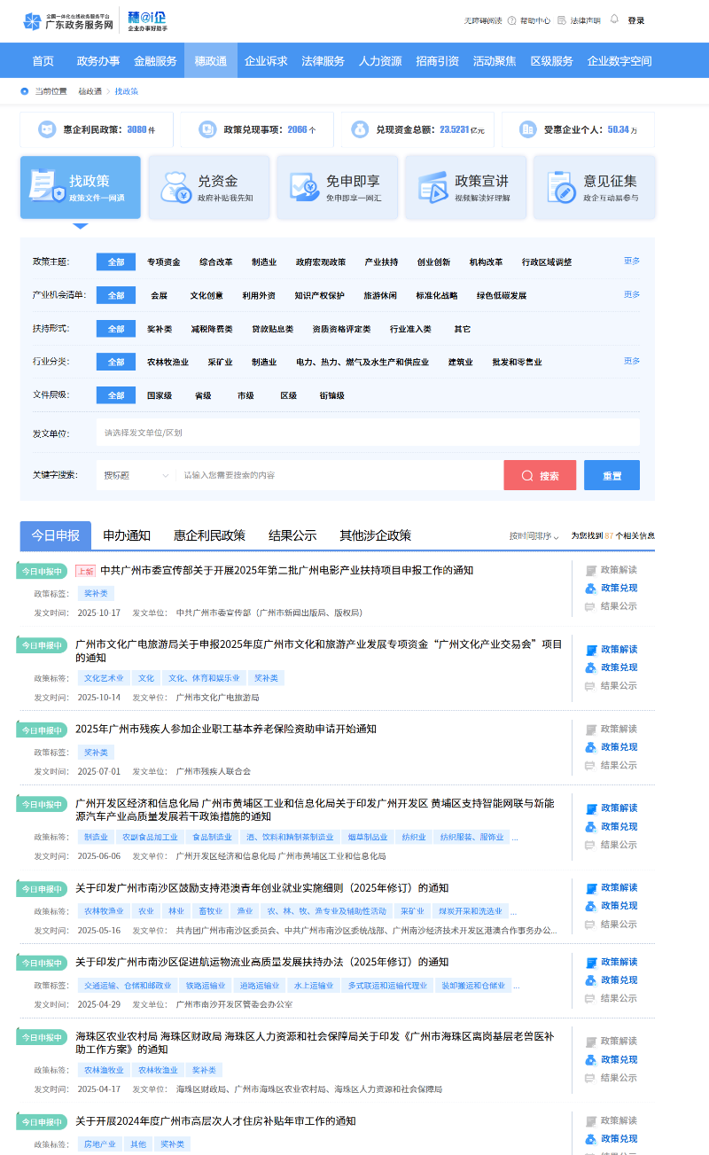 作為廣州市統(tǒng)一的企業(yè)服務(wù)總門戶,“穗@i企”平臺政策“源頭”為廣州市政策文件庫,通過統(tǒng)一標準接口獲取最權(quán)威的政策版本后,平臺用大數(shù)據(jù)算法給企業(yè)“畫像”,再和政策標簽智能匹配。據(jù)統(tǒng)計,平臺整合了3000多件惠企政策、3500多份解讀文件、2000多項兌現(xiàn)事項。截至目前,已為225萬家企業(yè)精準推送了4721多萬次政策提醒,30多萬家經(jīng)營主體通過它拿到了10多億元補貼,真正實現(xiàn)“政策找企業(yè)”“補貼一鍵達”。