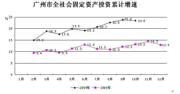 全社會固定資產投資快速增長。在新廣州站及相關工程、亞運村及亞運場館、地鐵工程等重點項目的帶動下,全社會固定資產投資保持快速增長。1―10月累計,全市完成全社會固定資產投資1789.19億元,同比增長23.4%,增幅比上半年提高4.2個百分點。其中,基本建設和更新改造投資增勢強勁,分別完成投資924.55億元和274.84億元,分別增長33.2%和59.8%;房地產開發投資轉降為升,完成投資582.01億元,增長0.6%。