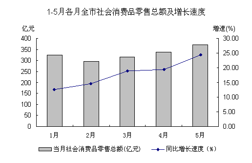 1.消費(fèi)品市場(chǎng)需求活躍。今年以來(lái),全市社會(huì)消費(fèi)品零售總額保持了穩(wěn)步快速增長(zhǎng),呈現(xiàn)出良好運(yùn)行態(tài)勢(shì)。從前五個(gè)月的統(tǒng)計(jì)數(shù)據(jù)來(lái)看,我市社會(huì)消費(fèi)品零售總額、增長(zhǎng)速度呈逐月提高的態(tài)勢(shì),體現(xiàn)了我市擴(kuò)大內(nèi)需、拉動(dòng)經(jīng)濟(jì)增長(zhǎng)取得了一定成效。1-5月各月社會(huì)消費(fèi)品零售總額均在296.99億元以上,增速在12.5%-24.4%的區(qū)間運(yùn)行。