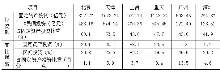 一季度,在我市固定資產投資中,民間投資完成221.49億元,同比增長46.6%;增速高于固定資產投資增速45.4個百分點,占固定資產投資總量的43.6%,比重同比提高13.5個百分點,在各經濟類型中所占比重最高,成為拉動投資增長的主力。其中完成投資超億元的項目有13個,同比增加4個,投資額達85.87億元,同比增長1.1倍。從我市與四個直轄市及深圳市的對比情況看,我市固定資產投資排第5位(見表1),民間投資同比增速居首位,占固定資產投資比重的升幅在六城市中為最高。
