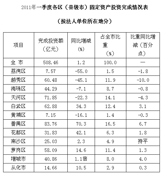一季度,從全市投資區域的分布情況看(按法人單位所在地劃分,下同,見表2),完成投資額居前三位的區依次為番禺區(83.76億元)、天河區(71.85億元)和白云區(62.88億元),分別占全市投資總量的16.5%、14.1%和12.4%;完成投資不足10億元的區有荔灣區(7.57億元)和黃埔區(7.15億元),兩區僅占全市投資總量的2.9%。