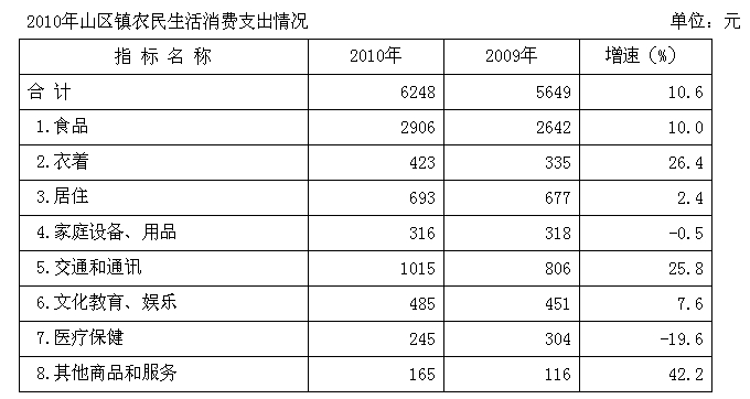 ㈡ 山區農民生活消費快速增長,但增速低于全市平均水平。2010年,山區鎮農村住戶農民人均生活消費支出6248元,比2009年增加599元,同比增長10.6%;比全市農民人均消費增速低5.5個百分點。在生活消費各類支出中,比2009年增長的有:食品消費支出增長10.0%,衣著消費支出增長26.4%,居住消費支出增長2.4%,交通和通訊消費支出增長25.8%,文化教育、娛樂消費支出增長7.6%,其他商品和服務消費支出增長42.2%;比2009年下降的有:醫療保健消費支出下降19.6%,家庭設備、用品消費支出下降0.5%(見下表)。