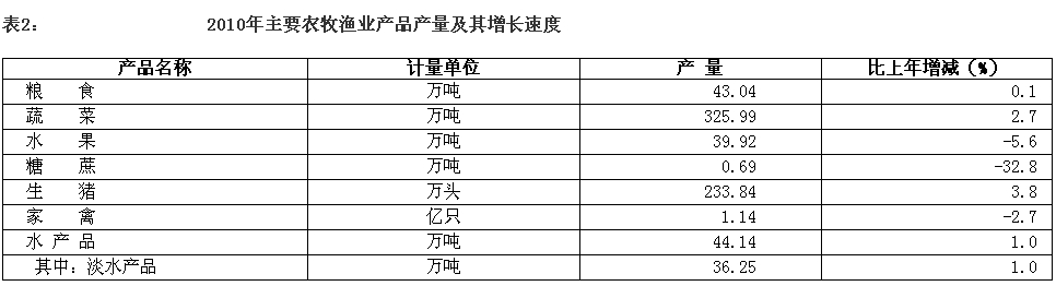 農業(yè)生產穩(wěn)定發(fā)展。全年完成農林牧漁業(yè)總產值323.4億元,增長3.5%。其中,農業(yè)、林業(yè)、牧業(yè)、漁業(yè)及農林牧漁服務業(yè)完成產值分別為164.6億元、2.1億元、62.5億元、62.1億元和32.1億元。農業(yè)商品產值292.3億元,增長3.8%。農產品產銷率為90.3%。