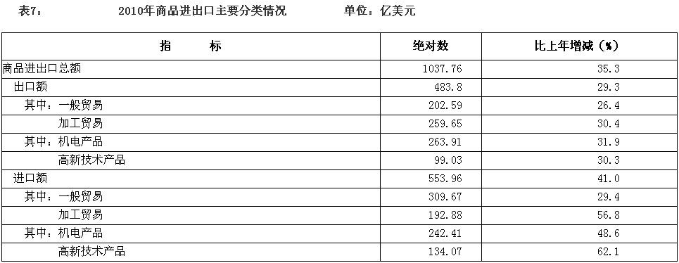 商品進出口較快增長。全年商品進出口總額1037.76億美元,增長35.3%。其中,商品出口總額483.8億美元,增長29.3%;商品進口總額553.96億美元,增長41.0%。外商及港澳臺投資企業(yè)出口285.26億美元,增長27.1%,占全市商品出口總值的59.0%;國有企業(yè)出口97.23億美元,增長27.9%;集體企業(yè)出口5.34億美元,增長14.7%;私營企業(yè)出口93.97億美元,增長39.1%。
