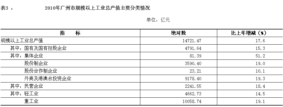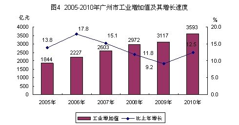 全市經濟保持較快發(fā)展。2010年,廣州市實現地區(qū)生產總值(GDP)10604.48億元,按可比價格計算,比上年(下同)增長13.0%。其中,第一產業(yè)增加值189.05億元,增長3.2%;第二產業(yè)增加值3950.64億元,增長13.0%;第三產業(yè)增加值6464.79億元,增長13.2%。第一、二、三次產業(yè)增加值的比例為1.8∶37.2∶61.0。三次產業(yè)對經濟增長的貢獻率分別為0.4%、38.4%和61.2%。