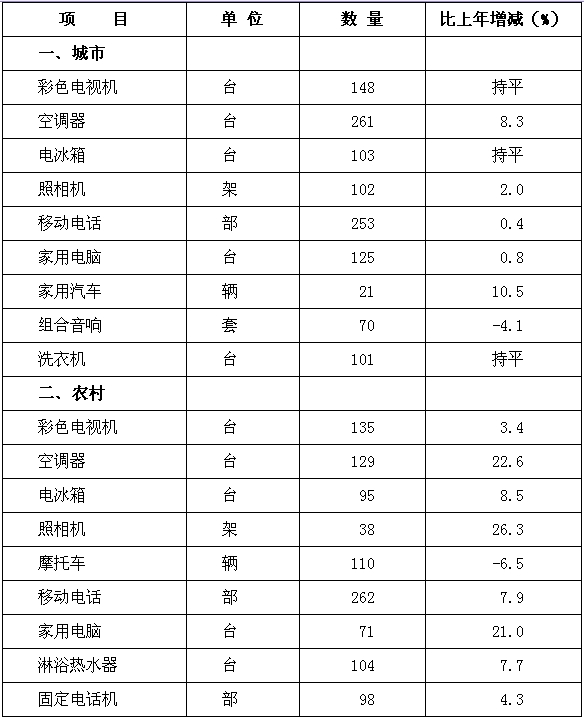 城鄉(xiāng)居民消費支出穩(wěn)步增長。全年城市居民家庭人均消費性支出25012元,增長9.6%;扣除價格因素,實際增長6.2%。其中,服務性消費支出9151元,增長9.3%,占消費性支出的36.6%。城市居民恩格爾系數為33.3%。農村居民家庭人均生活消費支出8987元,增長16.1%。農村居民恩格爾系數為45.9%。