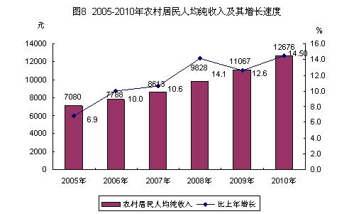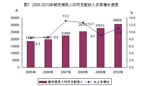 城鄉(xiāng)居民收入水平不斷提高。據城鄉(xiāng)居民家庭抽樣調查,全年城市居民家庭人均可支配收入30658元,增長11.0%,扣除價格因素,實際增長7.6%。農村居民家庭收入大幅增長,連續(xù)五年保持兩位數增長,全年農村居民家庭人均純收入12676元,增長14.5%,扣除價格因素,實際增長11%。