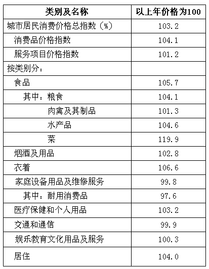 消費市場價格:消費價格明顯上升。全年城市居民消費價格總水平上升3.2%,其中,消費品價格上升4.1%,服務項目價格上升1.2%。