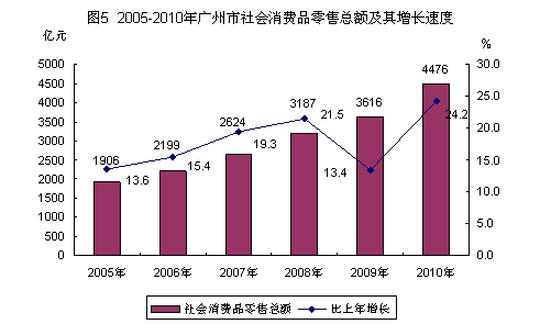 3. 統計圖中對2006-2008年廣州市生產總值數據及2005-2008年社會消費品零售總額已根據第二次經濟普查進行了修訂,對2006年農林牧漁業(yè)總產值數據根據第二次農業(yè)普查進行了修訂;