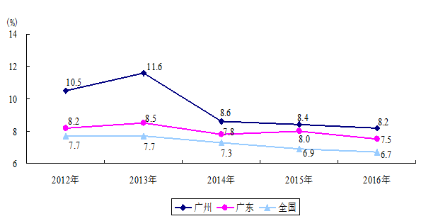 圖1:2012-2016年全國、廣東省、廣州市GDP增速