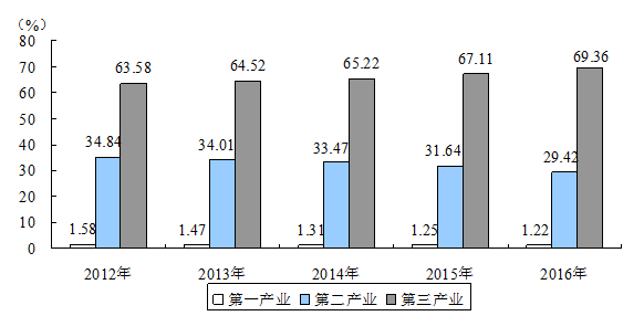 產業結構不斷優化。2016年,我市三次產業結構為1.22:29.42:69.36,第三產業占比由2012年的63.58%提高到69.36%,產業結構進一步優化(見圖2)。其中,第三產業對經濟增長的貢獻率于2015年首超七成后,2016年貢獻率繼續提高到78.9%,比2012年(69.3%)高9.6個點。其中批發零售、金融、房地產、租賃和商務服務、交通運輸5個服務業行業增加值超千億元。現代服務業增加值占服務業增加值的比重達65.00%,比2012年提高3.00個百分點。