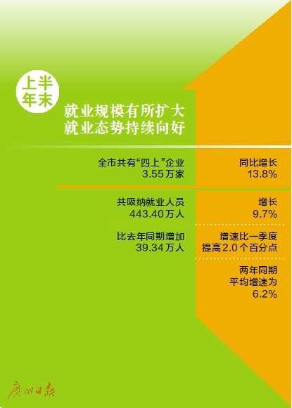 隨著營商環(huán)境優(yōu)化,廣州市場主體增加,帶動全市就業(yè)形勢穩(wěn)定向好。今年上半年末,廣州共有“四上”企業(yè)3.55萬家,同比增長13.8%,共吸納就業(yè)人員443.40萬人,比上年同期增加39.34萬人,增長9.7%。其中,八成以上行業(yè)就業(yè)人員增加,就業(yè)崗位呈現(xiàn)向中高端發(fā)展趨勢,天河區(qū)、黃埔區(qū)、越秀區(qū)吸納就業(yè)人員總量和增量分列全市前三。