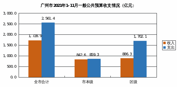 2021年1-11月,全市一般公共預算收入1,728.9億元,同比增長11.6%。其中:市本級收入842.6億元,同比增長13.7%;區級收入886.3億元,同比增長9.7%。全市一般公共預算支出2,561.4億元,完成年初預算94.6%,同比下降2.1%。其中:市本級支出859.3億元,同比下降3.8%;區級支出1,702.1億元,同比下降1.2%。