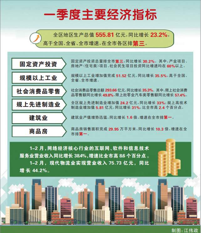 一季度,全區規模以上工業增加值完成51.52億元,同比增長35.5%,增速高于全國 (24.5%)、全省(28.9%)、全市(34.2%)。